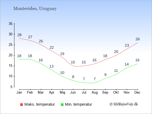 Graferne viser de gennemsnitlige maksimale temperaturer i Uruguay og København (typisk når solen står højest på himmelen om eftermiddagen) og de gennemsnitlige minimale temperaturer (typisk den laveste temperatur som måles om natten).