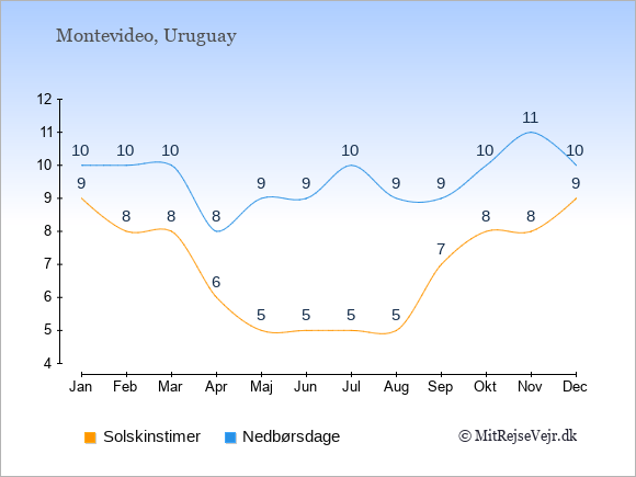 Graferne viser det gennemsnitlige antal solskinstimer i Montevideo pr. dag samt det gennemsnitlige antal dage med nedbør i Montevideo sammenlignet med København.
