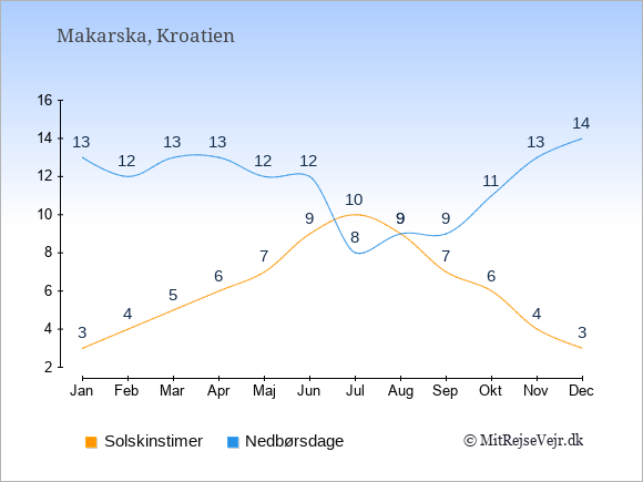Graferne viser det gennemsnitlige antal solskinstimer i Makarska pr. dag samt det gennemsnitlige antal dage med nedbør i Makarska sammenlignet med København.