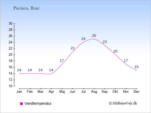 Se klimadata for Pucisca sammenlignet med klimaet i Danmark.