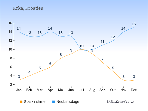 Grafen viser antallet af solskinstimer i Krka (d.v.s. det gennemsnitlige antal timer pr. dag hvor solen skinner), samt antallet af nedbørsdage (d.v.s. det gennemsnitlige antal dage i en given måned,