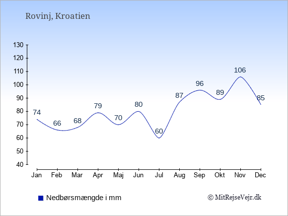Vejret i Rovinj er som regel bedst i de måneder, hvor der er mange solskinstimer og få nedbørsdage.