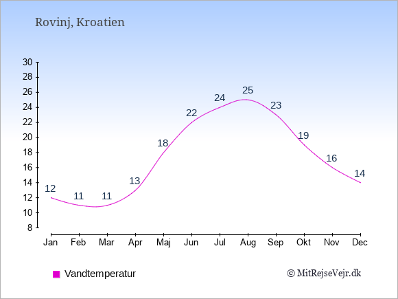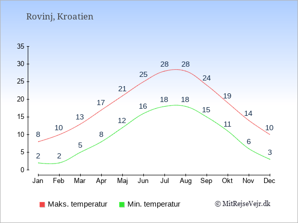 Grafen viser de gennemsnitlige maksimale temperaturer i Rovinj (som oftest den værdi, der er målt midt på dagen) og de gennemsnitlige minimale temperaturer (som oftest den værdi, der er målt midt om natten).