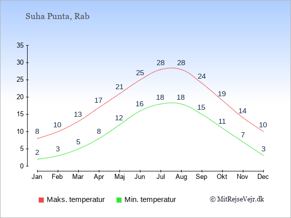 Grafen viser de gennemsnitlige maksimale temperaturer i Suha Punta (som oftest den værdi, der er målt midt på dagen) og de gennemsnitlige minimale temperaturer (som oftest den værdi, der er målt midt om natten).