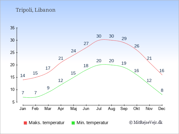 Graferne viser de gennemsnitlige maksimale temperaturer i Tripoli og København (typisk når solen står højest på himmelen om eftermiddagen) og de gennemsnitlige minimale temperaturer (typisk den laveste temperatur som måles om natten).