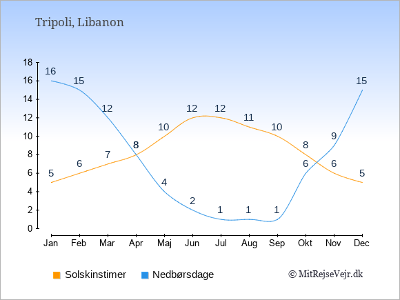 Graferne viser det gennemsnitlige antal solskinstimer i Tripoli pr. dag samt det gennemsnitlige antal dage med nedbør i Tripoli sammenlignet med København.