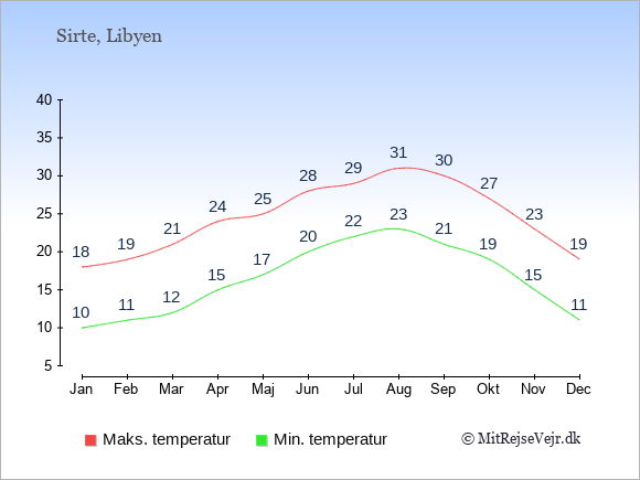 Graferne viser de gennemsnitlige maksimale temperaturer i Sirte og København (typisk når solen står højest på himmelen om eftermiddagen) og de gennemsnitlige minimale temperaturer (typisk den laveste temperatur som måles om natten).
