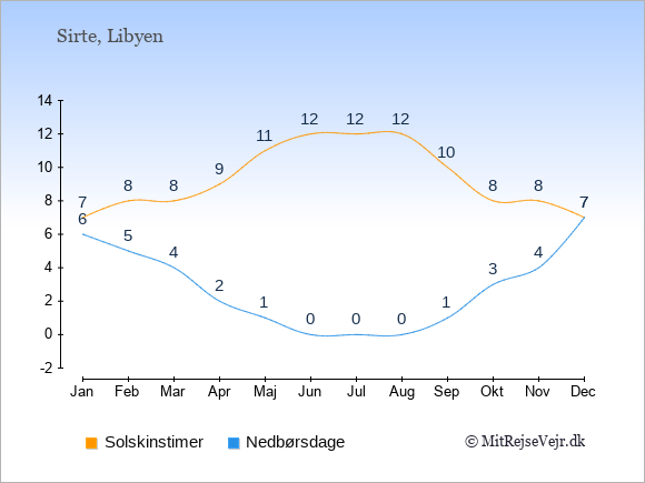 Graferne viser det gennemsnitlige antal solskinstimer i Sirte pr. dag samt det gennemsnitlige antal dage med nedbør i Sirte sammenlignet med København.