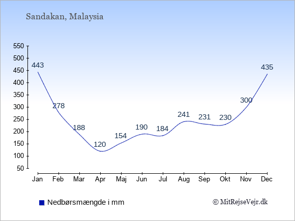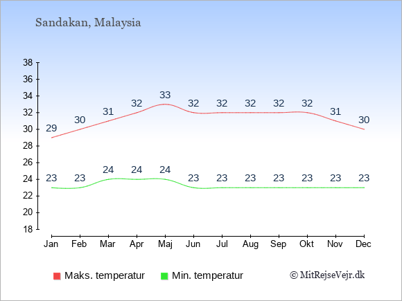 Grafen viser de gennemsnitlige maksimale temperaturer i Sandakan (som oftest den værdi, der er målt midt på dagen) og de gennemsnitlige minimale temperaturer (som oftest den værdi, der er målt midt om natten).