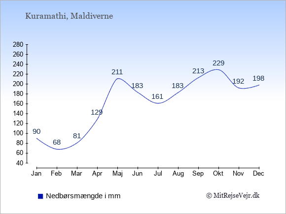 Vejret på Kuramathi er som regel bedst i de måneder, hvor der er mange solskinstimer og få nedbørsdage.