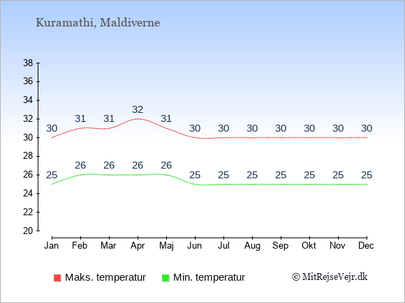 Grafen viser de gennemsnitlige maksimale temperaturer på Kuramathi (som oftest den værdi, der er målt midt på dagen) og de gennemsnitlige minimale temperaturer (som oftest den værdi, der er målt midt om natten).