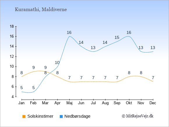 Grafen viser antallet af solskinstimer på Kuramathi (d.v.s. det gennemsnitlige antal timer pr. dag hvor solen skinner), samt antallet af nedbørsdage (d.v.s. det gennemsnitlige antal dage i en given måned,