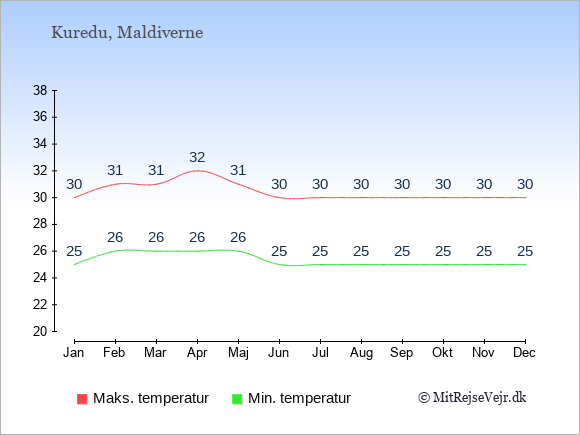 Grafen viser de gennemsnitlige maksimale temperaturer på Kuredu (som oftest den værdi, der er målt midt på dagen) og de gennemsnitlige minimale temperaturer (som oftest den værdi, der er målt midt om natten).
