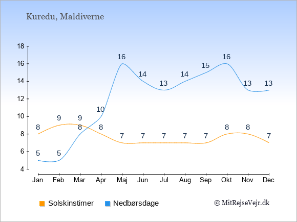 Grafen viser antallet af solskinstimer på Kuredu (d.v.s. det gennemsnitlige antal timer pr. dag hvor solen skinner), samt antallet af nedbørsdage (d.v.s. det gennemsnitlige antal dage i en given måned,