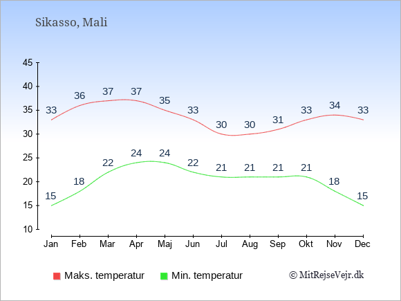 Grafen viser de gennemsnitlige maksimale temperaturer i Sikasso (som oftest den værdi, der er målt midt på dagen) og de gennemsnitlige minimale temperaturer (som oftest den værdi, der er målt midt om natten).