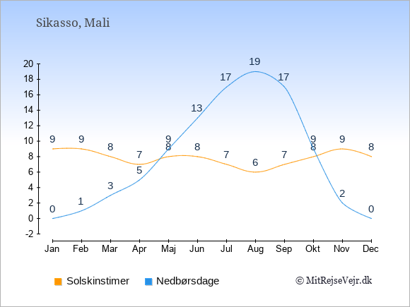 Grafen viser antallet af solskinstimer i Sikasso (d.v.s. det gennemsnitlige antal timer pr. dag hvor solen skinner), samt antallet af nedbørsdage (d.v.s. det gennemsnitlige antal dage i en given måned,