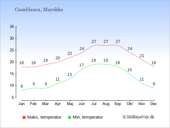 Graferne viser de gennemsnitlige maksimale temperaturer i Casablanca og København (typisk når solen står højest på himmelen om eftermiddagen) og de gennemsnitlige minimale temperaturer (typisk den laveste temperatur som måles om natten).