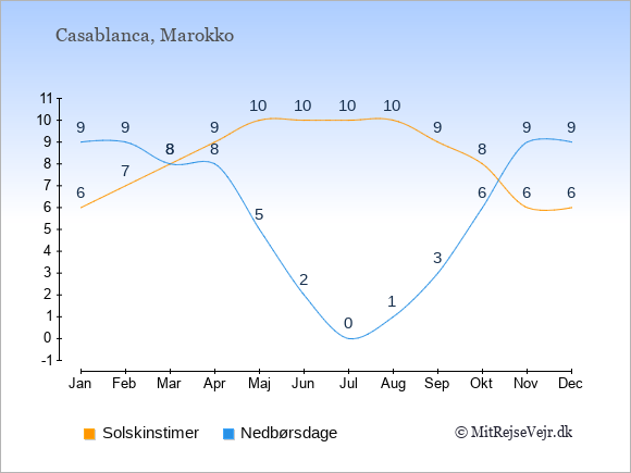 Graferne viser det gennemsnitlige antal solskinstimer i Casablanca pr. dag samt det gennemsnitlige antal dage med nedbør i Casablanca sammenlignet med København.