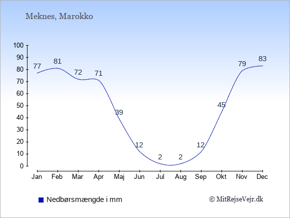 Se klimadata for Meknes sammenlignet med klimaet i Danmark.