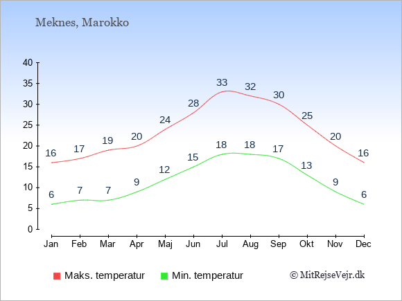 Graferne viser de gennemsnitlige maksimale temperaturer i Meknes og København (typisk når solen står højest på himmelen om eftermiddagen) og de gennemsnitlige minimale temperaturer (typisk den laveste temperatur som måles om natten).