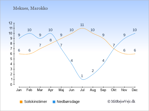 Graferne viser det gennemsnitlige antal solskinstimer i Meknes pr. dag samt det gennemsnitlige antal dage med nedbør i Meknes sammenlignet med København.