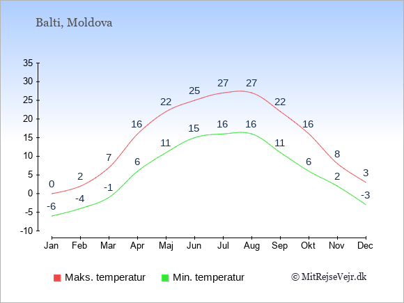 Grafen viser de gennemsnitlige maksimale temperaturer i Balti (som oftest den værdi, der er målt midt på dagen) og de gennemsnitlige minimale temperaturer (som oftest den værdi, der er målt midt om natten).