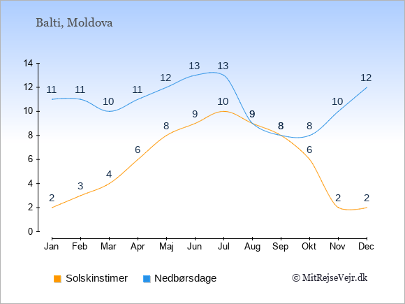Grafen viser antallet af solskinstimer i Balti (d.v.s. det gennemsnitlige antal timer pr. dag hvor solen skinner), samt antallet af nedbørsdage (d.v.s. det gennemsnitlige antal dage i en given måned,