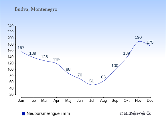 Se klimadata for Budva sammenlignet med klimaet i Danmark.