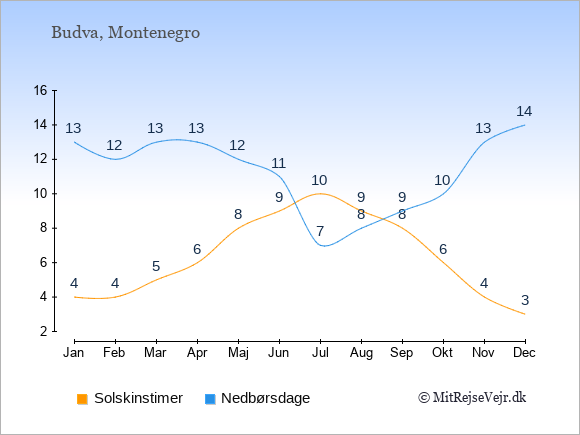 Graferne viser det gennemsnitlige antal solskinstimer i Budva pr. dag samt det gennemsnitlige antal dage med nedbør i Budva sammenlignet med København.