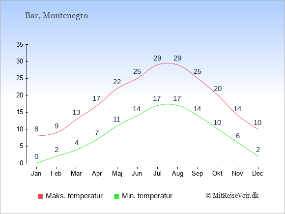 Grafen viser de gennemsnitlige maksimale temperaturer i Bar (som oftest den værdi, der er målt midt på dagen) og de gennemsnitlige minimale temperaturer (som oftest den værdi, der er målt midt om natten).
