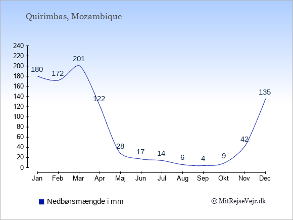 Hvis du vil se, hvordan vejret på Quirimbas adskiller sig fra vejret derhjemme, kan du sammenligne tallene måned for måned med de tilsvarende tal for Danmark under Quirimbas: klima & vejr.