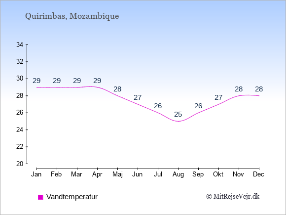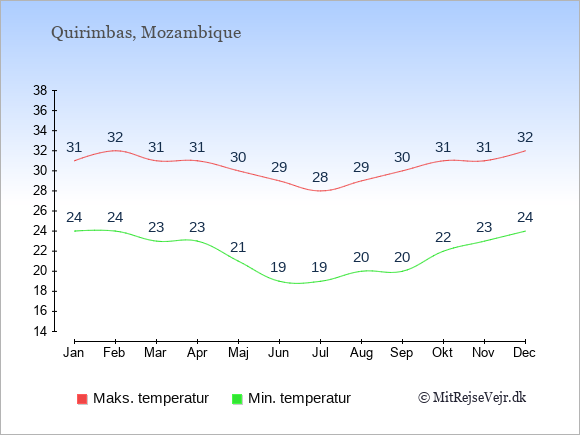 Grafen viser de gennemsnitlige maksimale temperaturer på Quirimbas (som oftest den værdi, der er målt midt på dagen) og de gennemsnitlige minimale temperaturer (som oftest den værdi, der er målt midt om natten).