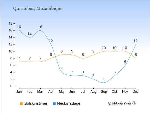 Grafen viser antallet af solskinstimer på Quirimbas (d.v.s. det gennemsnitlige antal timer pr. dag hvor solen skinner), samt antallet af nedbørsdage (d.v.s. det gennemsnitlige antal dage i en given måned,