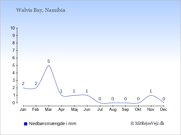Grafen viser antallet af solskinstimer i Walvis Bay (d.v.s. det gennemsnitlige antal timer pr. dag hvor solen skinner), samt antallet af nedbørsdage (d.v.s. det gennemsnitlige antal dage i en given måned,