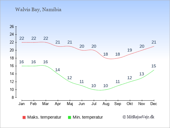 Grafen viser de gennemsnitlige maksimale temperaturer i Walvis Bay (som oftest den værdi, der er målt midt på dagen) og de gennemsnitlige minimale temperaturer (som oftest den værdi, der er målt midt om natten).