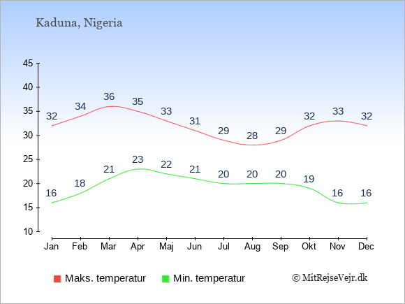Grafen viser de gennemsnitlige maksimale temperaturer i Kaduna (som oftest den værdi, der er målt midt på dagen) og de gennemsnitlige minimale temperaturer (som oftest den værdi, der er målt midt om natten).