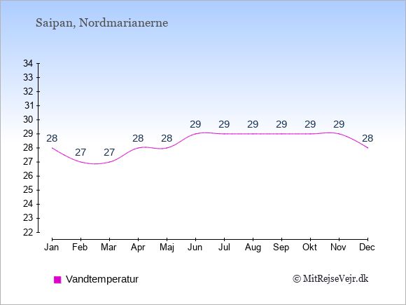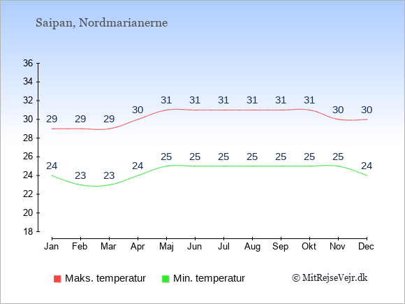 Grafen viser de gennemsnitlige maksimale temperaturer i Saipan (som oftest den værdi, der er målt midt på dagen) og de gennemsnitlige minimale temperaturer (som oftest den værdi, der er målt midt om natten).
