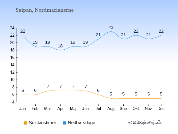 Grafen viser antallet af solskinstimer i Saipan (d.v.s. det gennemsnitlige antal timer pr. dag hvor solen skinner), samt antallet af nedbørsdage (d.v.s. det gennemsnitlige antal dage i en given måned,