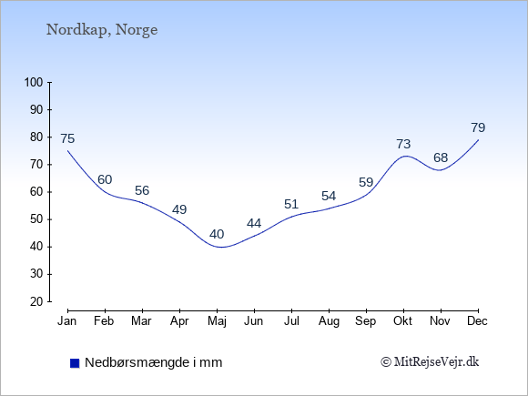 Her på siden kan du få et samlet overblik over det gennemsnitlige klima i Nordkap måned for måned sammenlignet med klimaet i København. Oplysningerne om det historiske klima kan du bruge til at planlægge din ferie og finde det bedste tidspunkt at rejse til Nordkap på.
