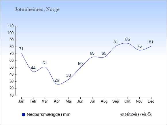 Hvis du vil se, hvordan vejret i Jotunheimen adskiller sig fra vejret derhjemme, kan du sammenligne tallene måned for måned med de tilsvarende tal for Danmark under Jotunheimen: klima & vejr.