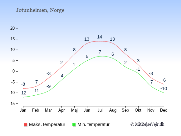 Grafen viser de gennemsnitlige maksimale temperaturer i Jotunheimen (som oftest den værdi, der er målt midt på dagen) og de gennemsnitlige minimale temperaturer (som oftest den værdi, der er målt midt om natten).