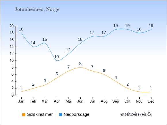 Grafen viser antallet af solskinstimer i Jotunheimen (d.v.s. det gennemsnitlige antal timer pr. dag hvor solen skinner), samt antallet af nedbørsdage (d.v.s. det gennemsnitlige antal dage i en given måned,