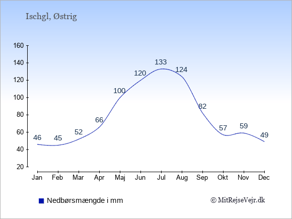 Se klimadata for Ischgl sammenlignet med klimaet i Danmark.