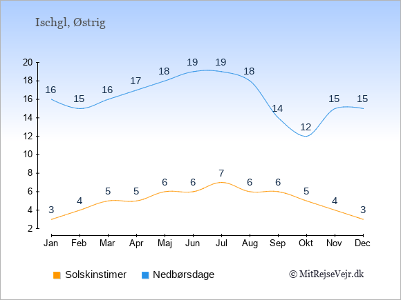 Graferne viser det gennemsnitlige antal solskinstimer i Ischgl pr. dag samt det gennemsnitlige antal dage med nedbør i Ischgl sammenlignet med København.