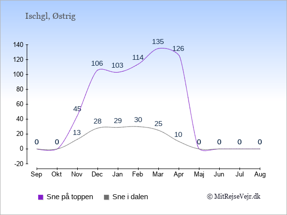 Grafen viser de gennemsnitlige maksimale temperaturer i Ischgl (som oftest den værdi, der er målt midt på dagen) og de gennemsnitlige minimale temperaturer (som oftest den værdi, der er målt midt om natten).