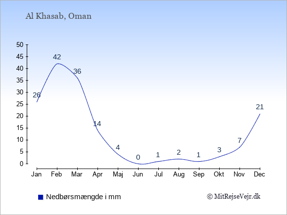 Hvis du vil se, hvordan vejret i Al Khasab adskiller sig fra vejret derhjemme, kan du sammenligne tallene måned for måned med de tilsvarende tal for Danmark under Al Khasab: klima & vejr.