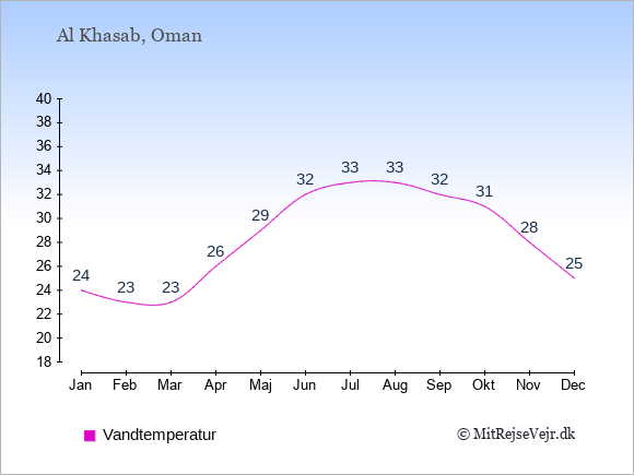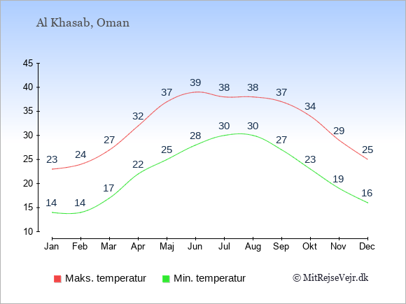 Grafen viser de gennemsnitlige maksimale temperaturer i Al Khasab (som oftest den værdi, der er målt midt på dagen) og de gennemsnitlige minimale temperaturer (som oftest den værdi, der er målt midt om natten).