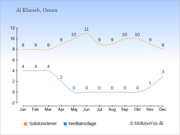 Grafen viser antallet af solskinstimer i Al Khasab (d.v.s. det gennemsnitlige antal timer pr. dag hvor solen skinner), samt antallet af nedbørsdage (d.v.s. det gennemsnitlige antal dage i en given måned,