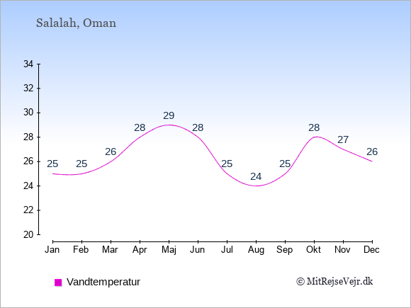 Grafen viser de gennemsnitlige maksimale temperaturer i Salalah (som oftest den værdi, der er målt midt på dagen) og de gennemsnitlige minimale temperaturer (som oftest den værdi, der er målt midt om natten).
