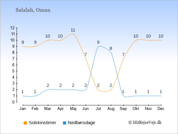 Grafen viser antallet af solskinstimer i Salalah (d.v.s. det gennemsnitlige antal timer pr. dag hvor solen skinner), samt antallet af nedbørsdage (d.v.s. det gennemsnitlige antal dage i en given måned,
